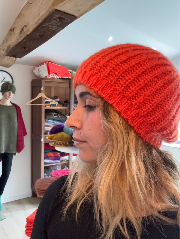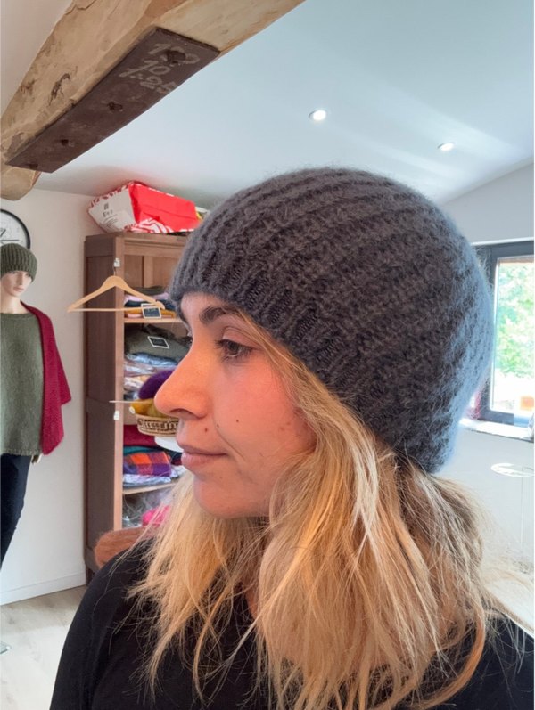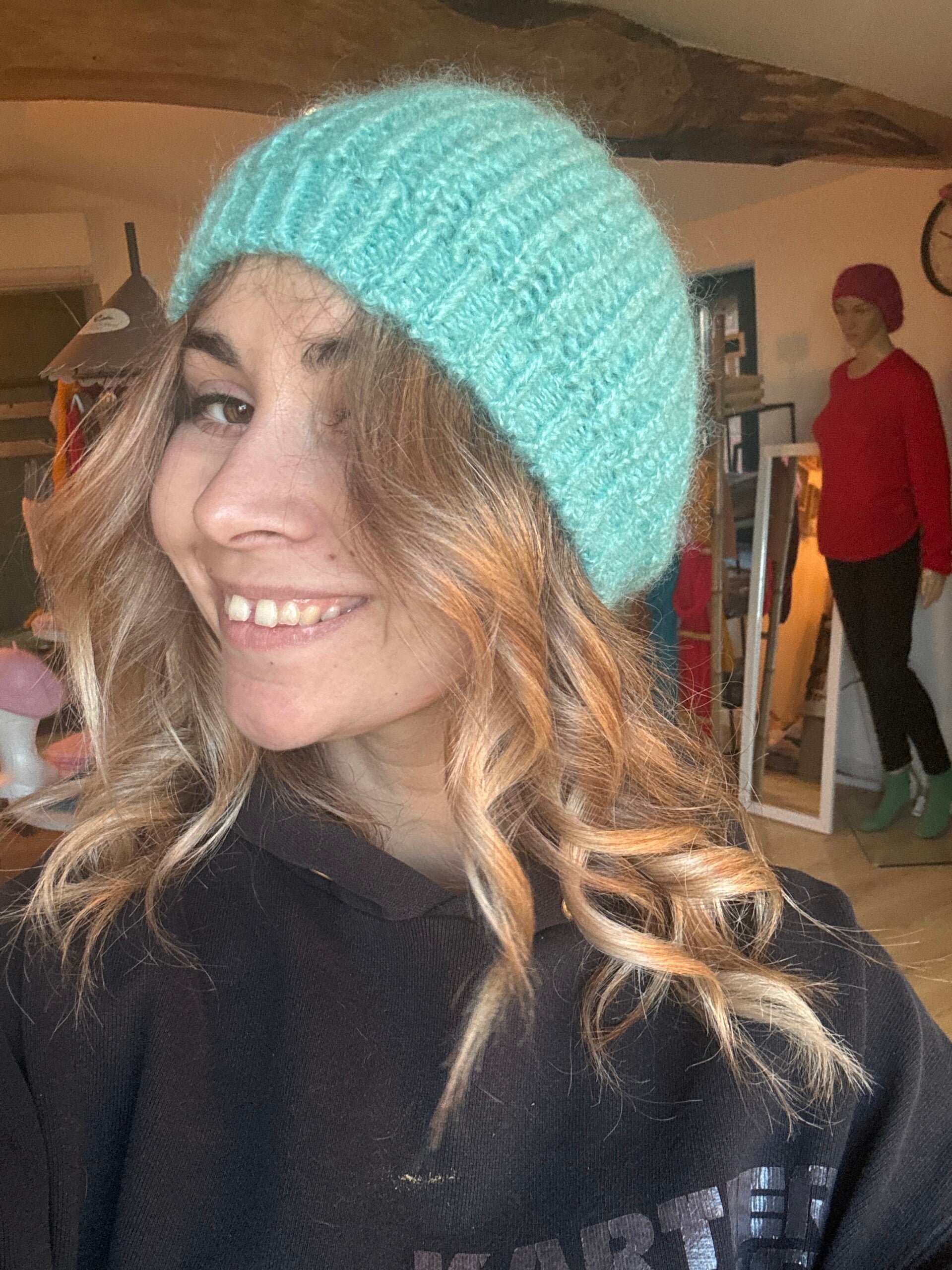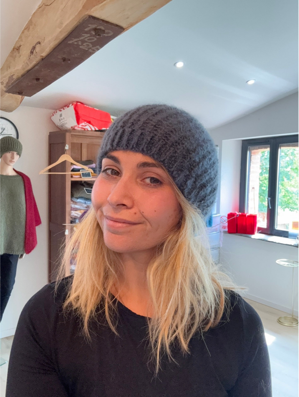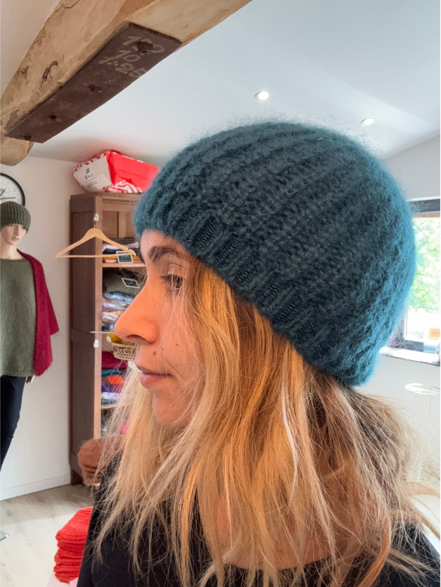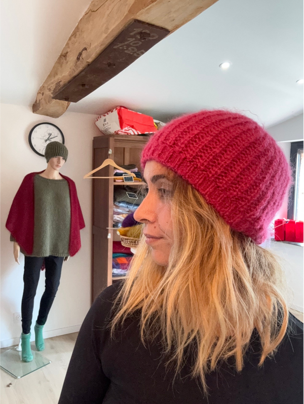 Protégez vous du froid grâce à ce petit bonnet en côtes tricoté en mohair de chevreau du mohair de gourjade.